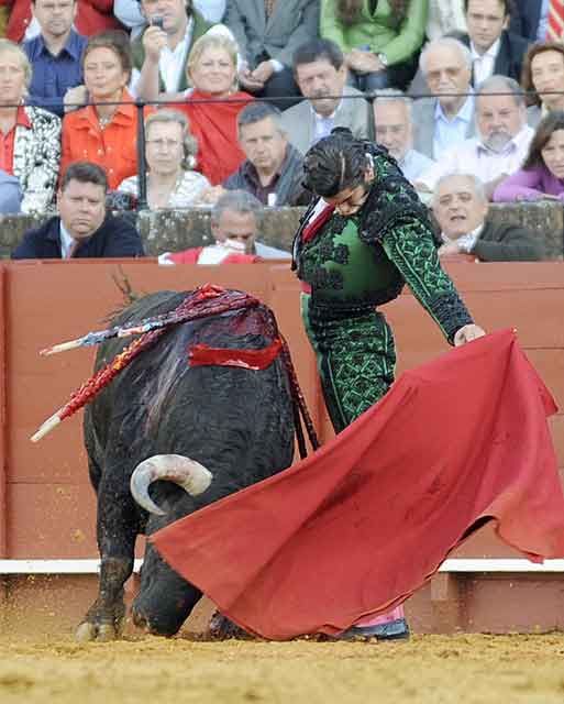 Invece Morante lo torea magistralmente, con il temple, il gusto, l’arte di sempre. A cui aggiunge una passione totale, con una tecnica perfetta, dal pericolo estremo disegnando serie memorabili, soprattutto dal corno destro. Un incontro indimenticabile con superbi kikirikis, trincherillas, cambios de manos, pases de pechos da cineteca che adornano una faena intensa quanto inattesa. La scelta di tempi e terreni perfetti preparano il toro per il momento della verità. Morante esegue la stoccata della sua vita (per perfezione tecnica, collocazione, lentezza e rischio assoluto) ed il toro cade all’istante. Morante salta di gioia e commozione insieme al resto dell’arena.